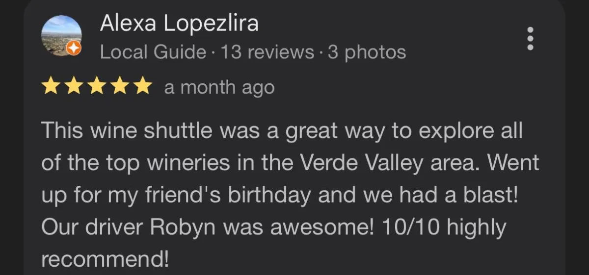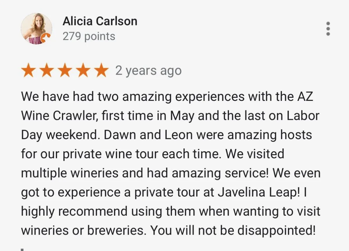 "We booked the AZ Wine Crawl for a girls' weekend and it blew away every expectation. Every stop was hand-picked—boutique vineyards, amazing views, and a personal touch at each tasting. The vibe was relaxed but first-class. Our guide made the day feel like a private VIP experience!"