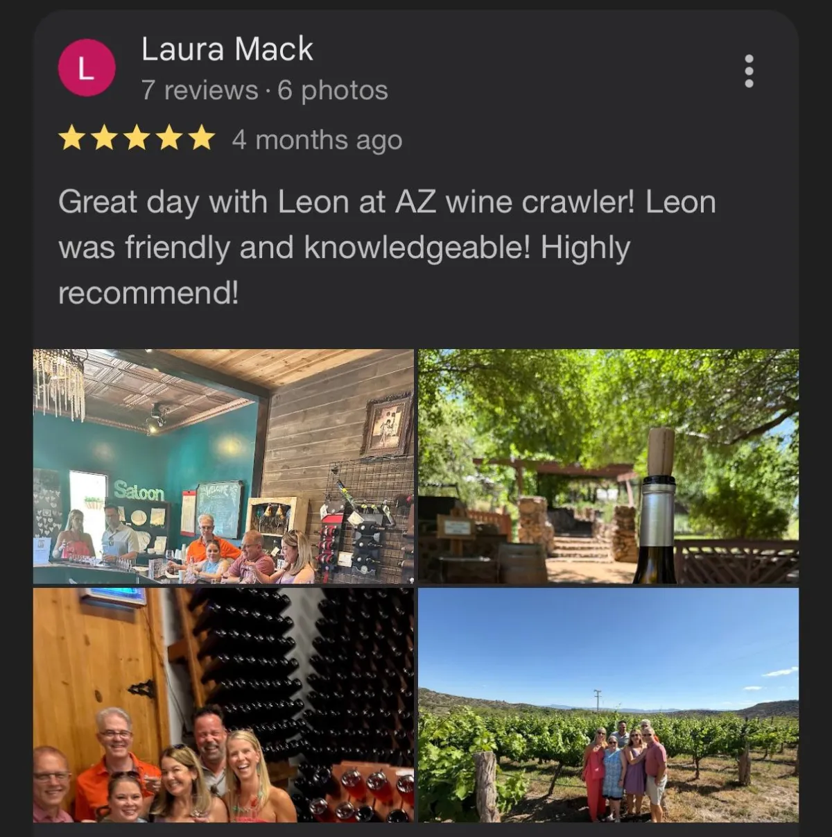 "Booked the AZ Wine Crawl for my 50th birthday and it turned into a legendary day! Private tastings, laughter, local wines I'd never even heard of, and the friendliest hosts. Everyone keeps asking how I found it—I just tell them it's Arizona's best-kept secret."